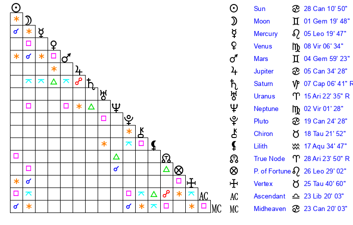 | Moon | 1 Gemini 13 | 18 Gemini 17 | 6 Sagittarius 31 |
