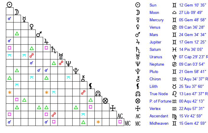 | Sun | 12 Gemini 11 | 13 Gemini 22 | 6 Libra 37 |