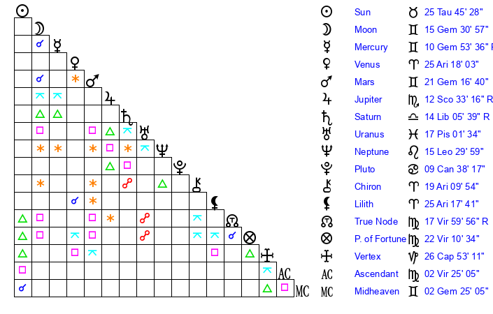 | Mercury | 10 Gemini 53 | 12 Taurus 58 | 29 Virgo 44 |