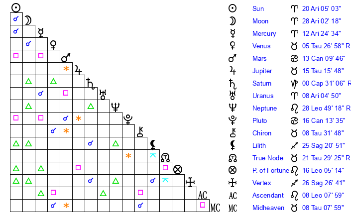 | Moon | 28 Aries 3 | 22 Virgo 49 | 13 Scorpio 4 |