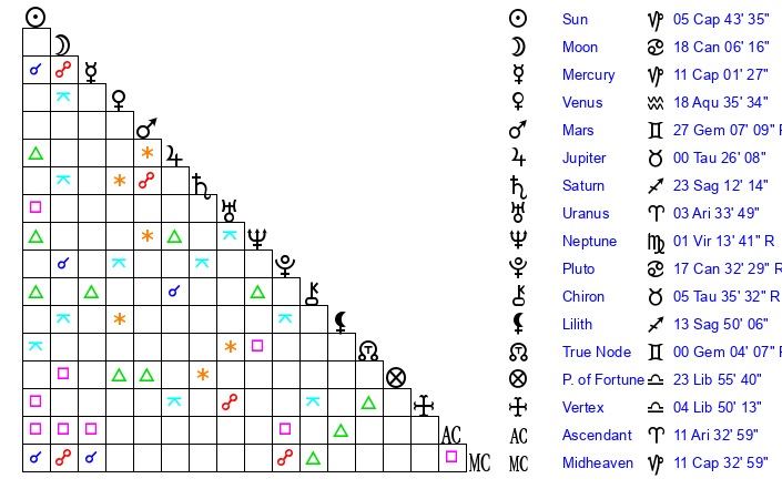 | Saturn | 23 Sagittarius 32 | 14 Pisces 9 | 0 Capricorn 48 |