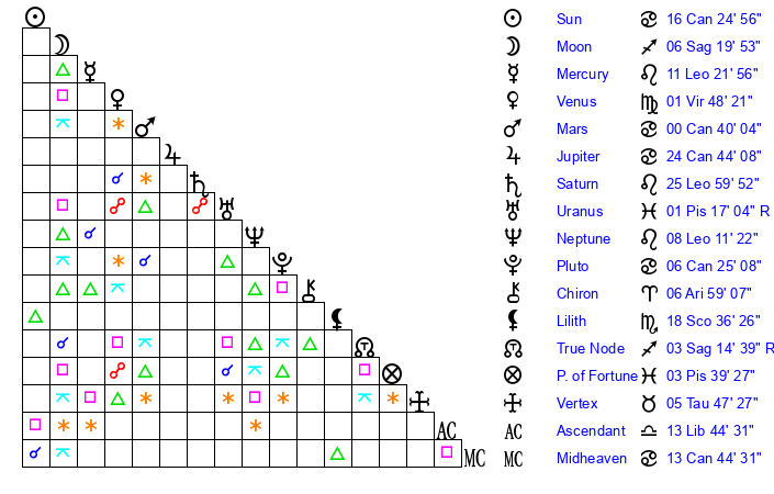 | Pluto | 6 Cancer 25 | 2 Aquarius 56 | 7 Cancer 43 |