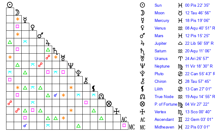 | Sun | 0 Pisces 22 | 1 Pisces 18 | 29 Taurus 56 |