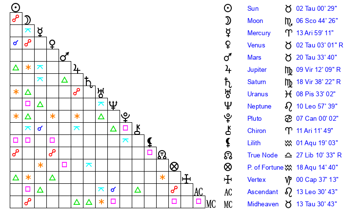 | Venus | 2 Taurus 3 | 26 Pisces 22 | 29 Gemini 0 |