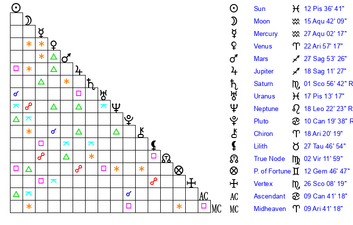 | Sun | 12 Pisces 37 | 13 Pisces 7 | 21 Gemini 10 |