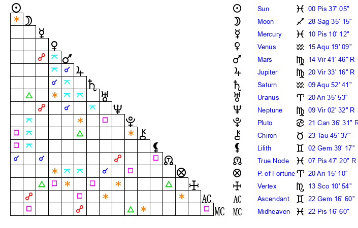 | Sun | 0 Pisces 37 | 1 Pisces 18 | 1 Gemini 7 |