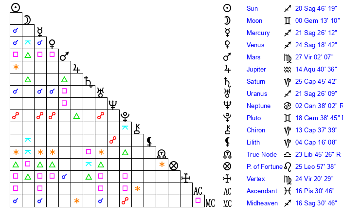 | Moon | 0 Gemini 18 | 12 Libra 36 | 8 Sagittarius 14 |