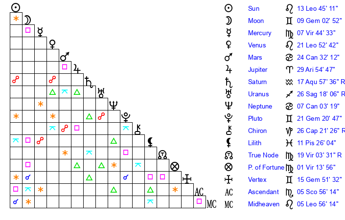 | Sun | 13 Leo 45 | 14 Leo 29 | 13 Sagittarius 10 |