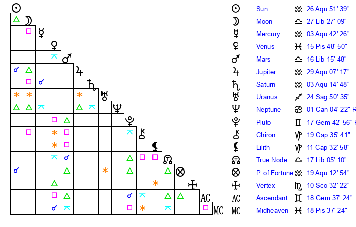 | Sun | 26 Aquarius 52 | 28 Aquarius 16 | 26 Gemini 15 |