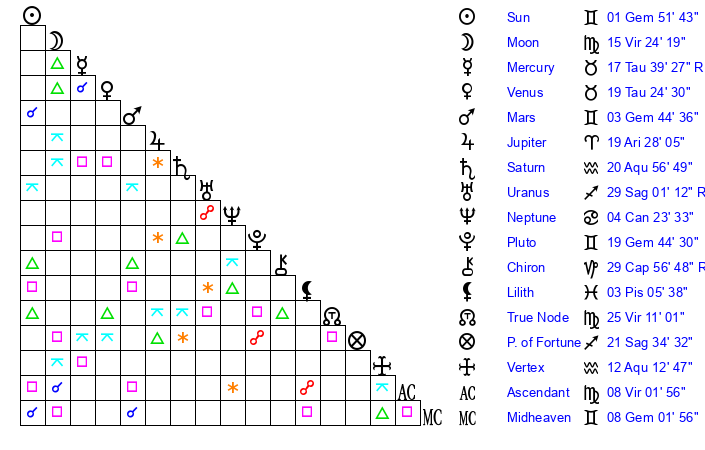 | Pluto | 19 Gemini 45 | 3 Aquarius 43 | 21 Gemini 44 |