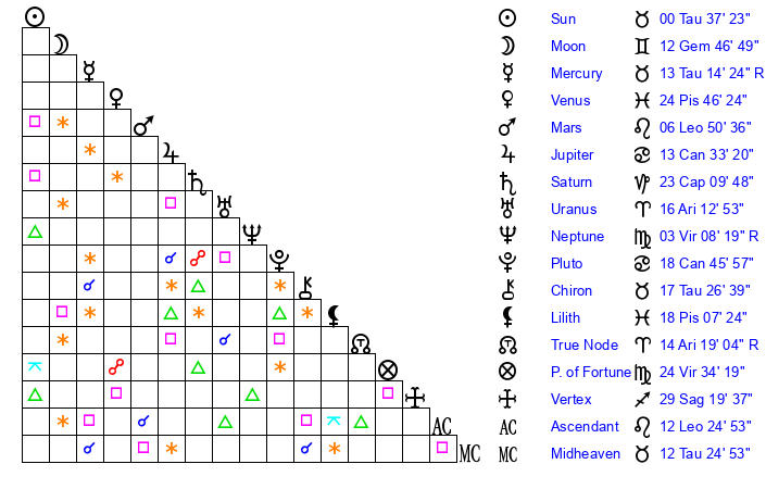 | Sun | 0 Taurus 37 | 1 Taurus 50 | 0 Leo 49 |
