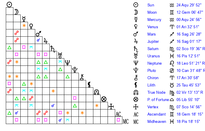 | Sun | 24 Aquarius 30 | 26 Aquarius 0 | 3 Gemini 56 |