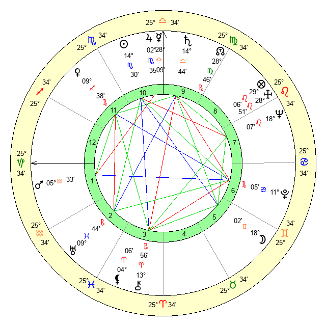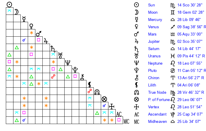 | Sun | 14 Scorpio 30 | 15 Scorpio 32 | 29 Aquarius 2 |