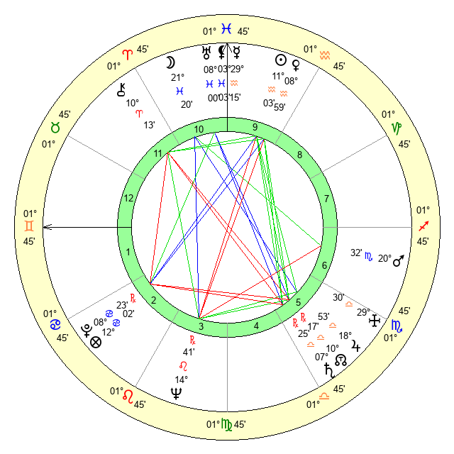 | Venus | 8 Aquarius 59 | 27 Pisces 13 | 16 Gemini 40 |