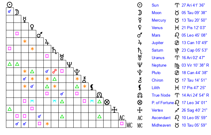 | Moon | 5 Taurus 15 | 1 Capricorn 18 | 21 Libra 17 |
