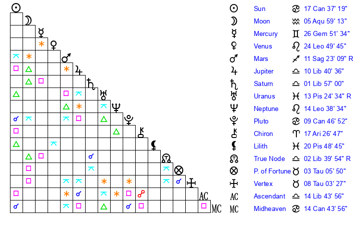| Pluto | 9 Cancer 46 | 2 Aquarius 55 | 11 Cancer 11 |