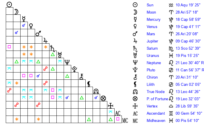 | Moon | 29 Aries 1 | 26 Aquarius 25 | 18 Sagittarius 37 |