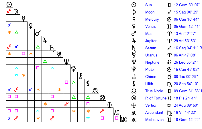 | Sun | 12 Gemini 50 | 13 Gemini 22 | 15 Virgo 46 |