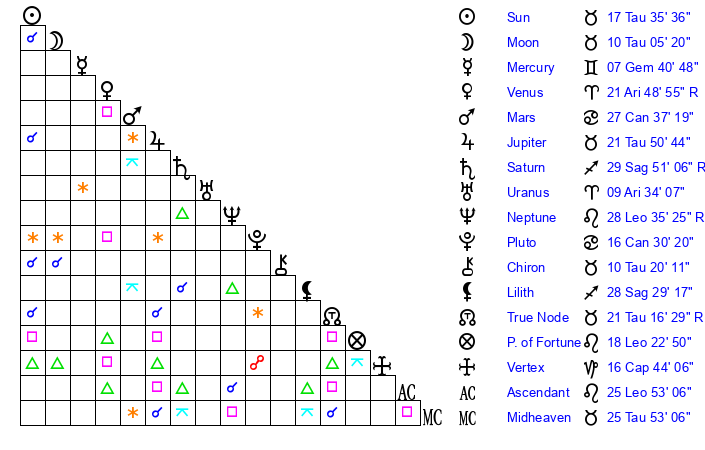 | Sun | 17 Taurus 36 | 18 Taurus 21 | 19 Leo 28 |