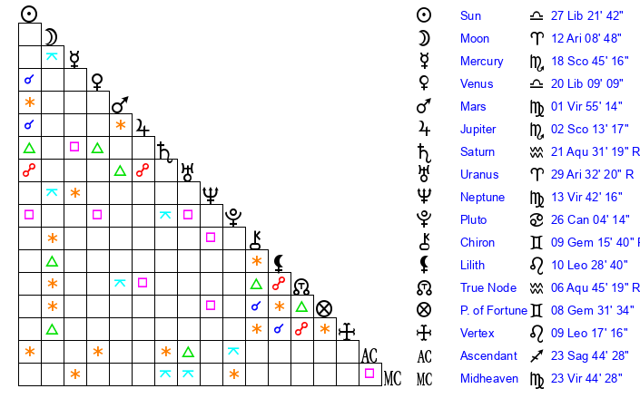 | Moon | 12 Aries 9 | 27 Libra 35 | 8 Leo 7 |