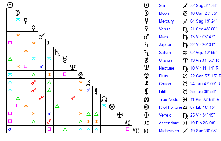 | Sun | 22 Sagittarius 31 | 22 Sagittarius 57 | 26 Pisces 39 |