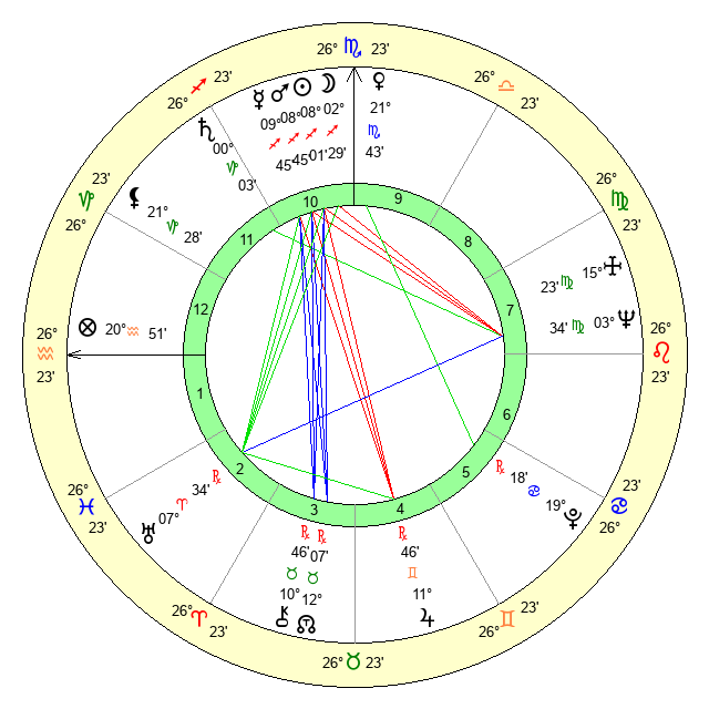 | Neptune | 3 Virgo 35 | 29 Pisces 23 | 1 Virgo 51 |