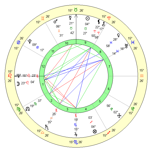 | Moon | 23 Leo 7 | 6 Aries 0 | 22 Taurus 1 |