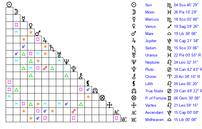 | Moon | 26 Pisces 16 | 24 Capricorn 21 | 12 Scorpio 53 |
