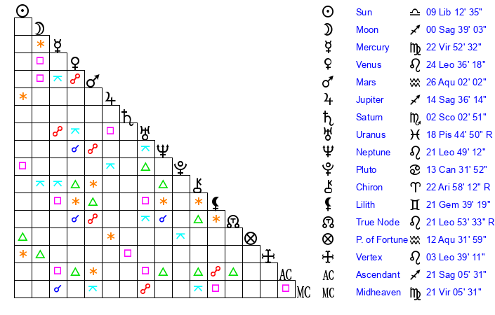 | Moon | 0 Sagittarius 31 | 11 Aquarius 25 | 8 Leo 24 |