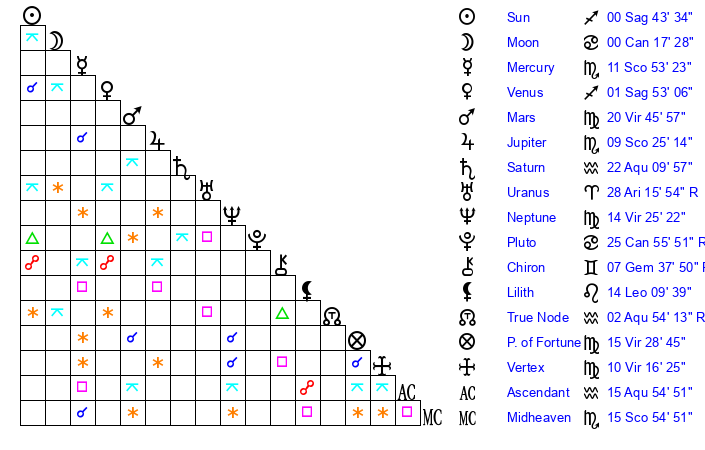| Mercury | 11 Scorpio 53 | 24 Scorpio 6 | 21 Aquarius 56 |