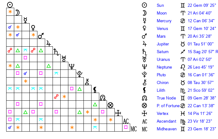 | Sun | 22 Gemini 9 | 22 Gemini 41 | 25 Virgo 16 |