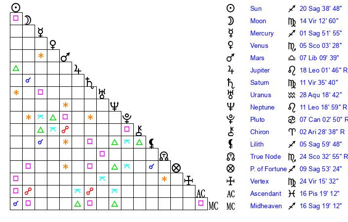| Saturn | 12 Virgo 18 | 25 Pisces 17 | 6 Virgo 52 |
