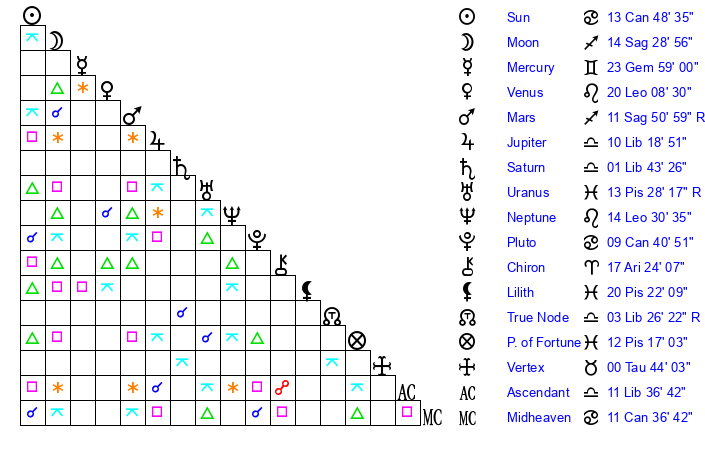 | Sun | 13 Cancer 49 | 14 Cancer 52 | 23 Libra 32 |