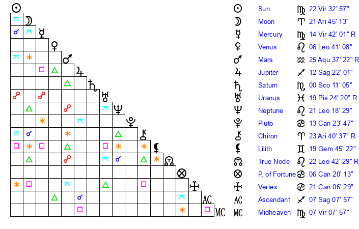 | Moon | 21 Aries 46 | 9 Cancer 23 | 27 Sagittarius 14 |