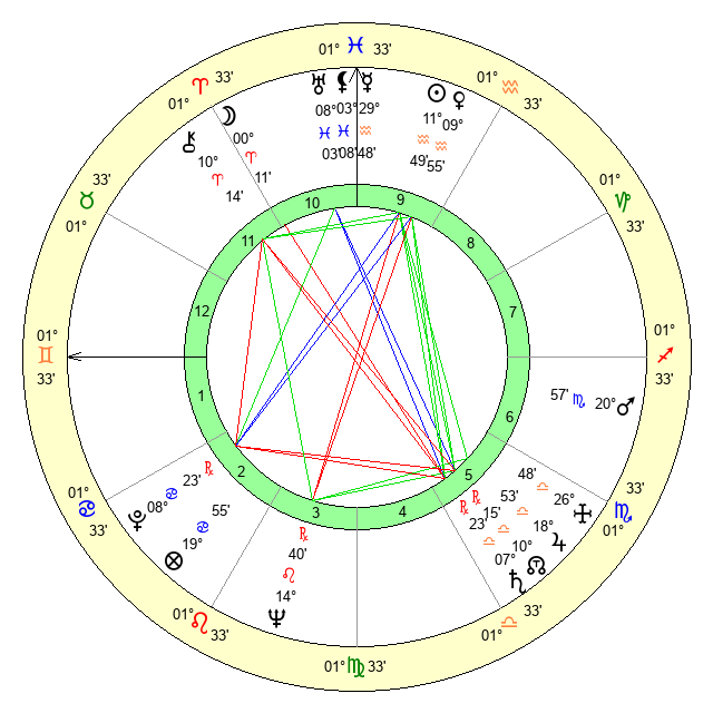 | Venus | 9 Aquarius 56 | 27 Pisces 48 | 17 Gemini 34 |