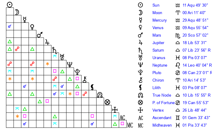 | Moon | 0 Aries 11 | 21 Pisces 25 | 16 Capricorn 33 |
