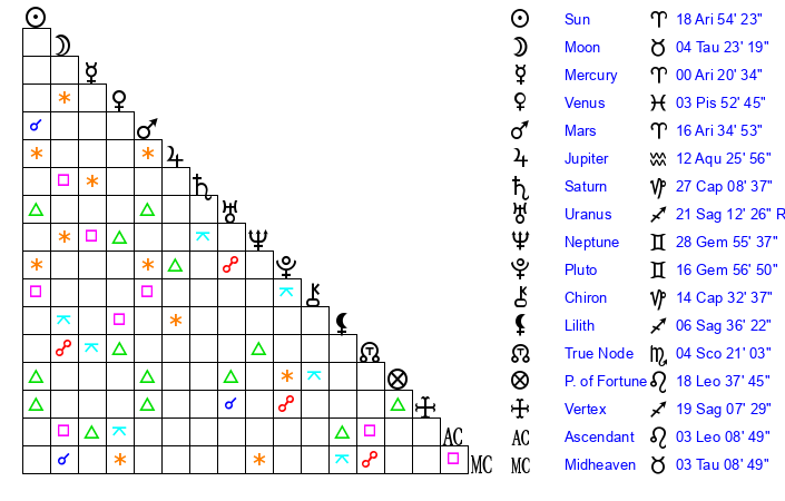 | Sun | 18 Aries 54 | 20 Aries 5 | 17 Leo 6 |
