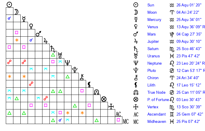 | Venus | 13 Aquarius 36 | 6 Aries 58 | 20 Aries 35 |