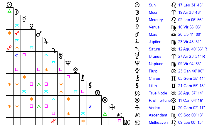 | Moon | 19 Aries 44 | 5 Pisces 50 | 20 Leo 0 |