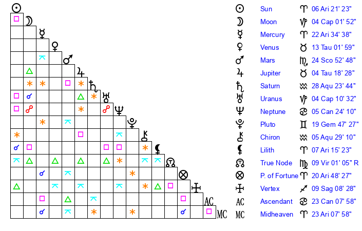 | Sun | 6 Aries 22 | 7 Aries 16 | 2 Leo 2 |