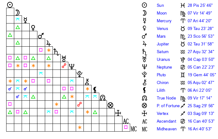 | Moon | 7 Virgo 23 | 28 Scorpio 12 | 7 Aquarius 16 |