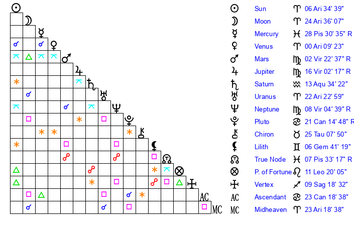 | Sun | 6 Aries 34 | 7 Aries 16 | 5 Cancer 33 |