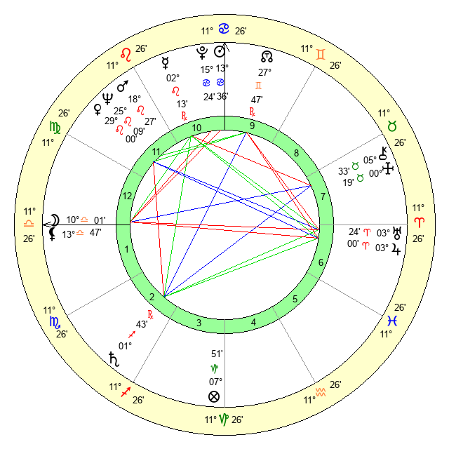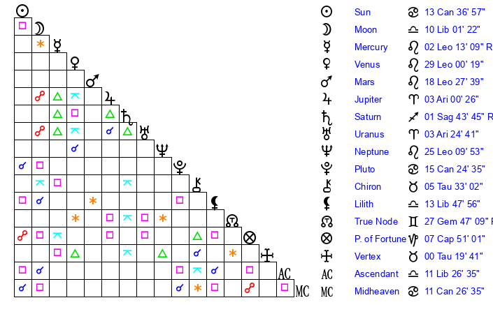 | Moon | 10 Libra 5 | 27 Scorpio 25 | 14 Taurus 8 |