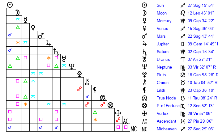 | Sun | 27 Sagittarius 20 | 28 Sagittarius 17 | 3 Aries 20 |