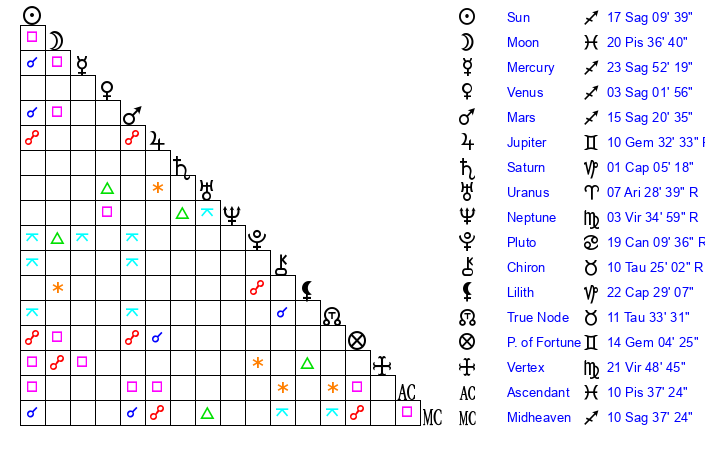 | Sun | 17 Sagittarius 9 | 18 Sagittarius 7 | 23 Pisces 24 |