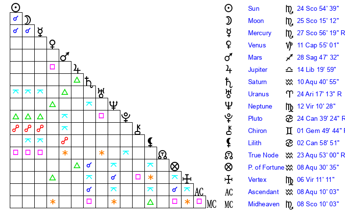 | Sun | 24 Scorpio 54 | 25 Scorpio 36 | 28 Aquarius 21 |