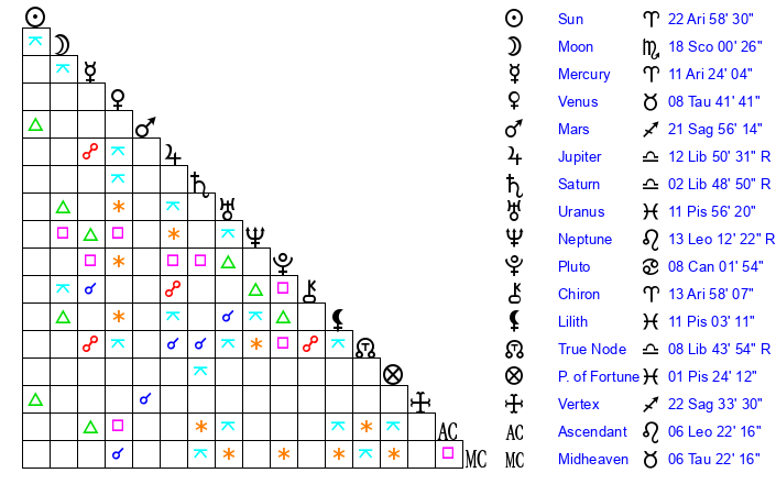 | Sun | 22 Aries 59 | 24 Aries 1 | 1 Leo 56 |