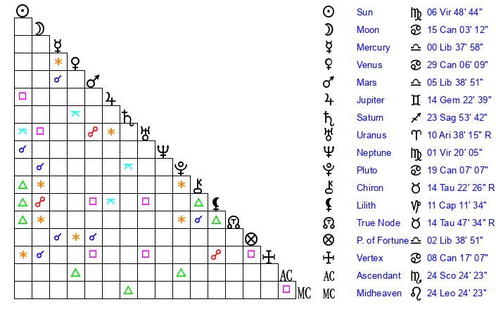 | Sun | 6 Virgo 49 | 7 Virgo 34 | 12 Sagittarius 5 |