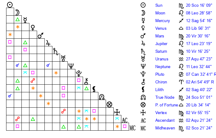 | Sun | 20 Scorpio 16 | 21 Scorpio 34 | 7 Pisces 49 |