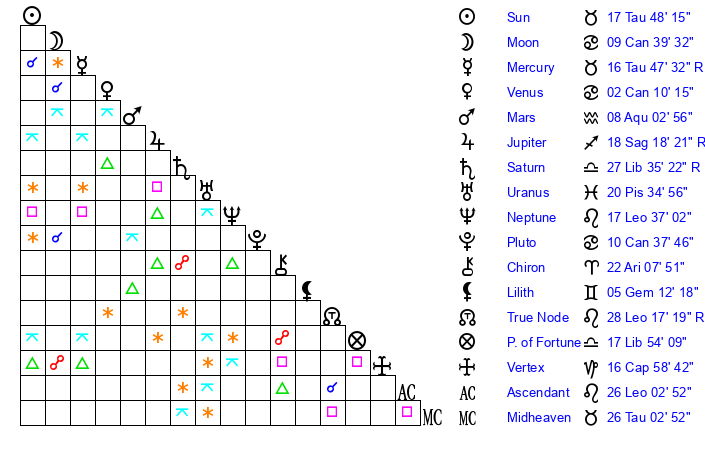 | Neptune | 17 Leo 36 | 1 Aries 19 | 20 Leo 17 |